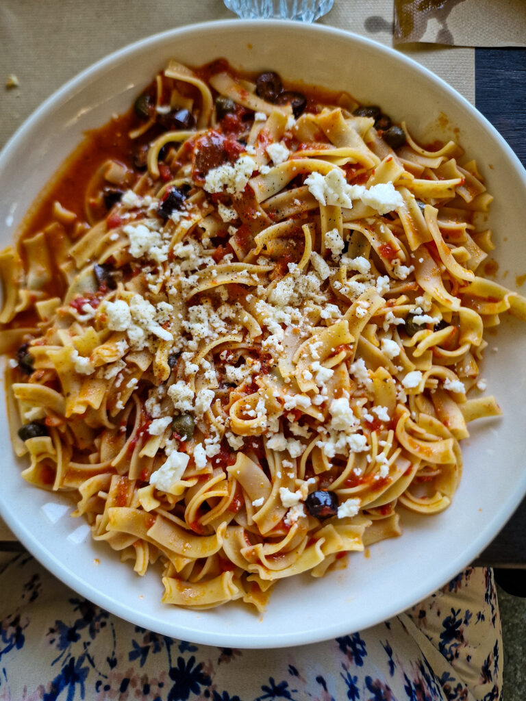 Successivamente ordiniamo l’horta e un piatto di hilopites, una pasta greca fatta con farina, uova, latte e sale. Di solito non mangio pasta all’estero, ma questa era un prodotto tipico: condita con feta, pomodoro, olive e capperi, aveva un sapore mediterraneo irresistibile.